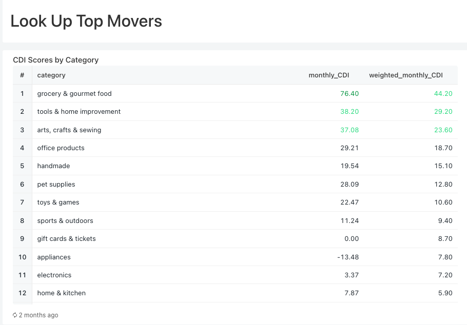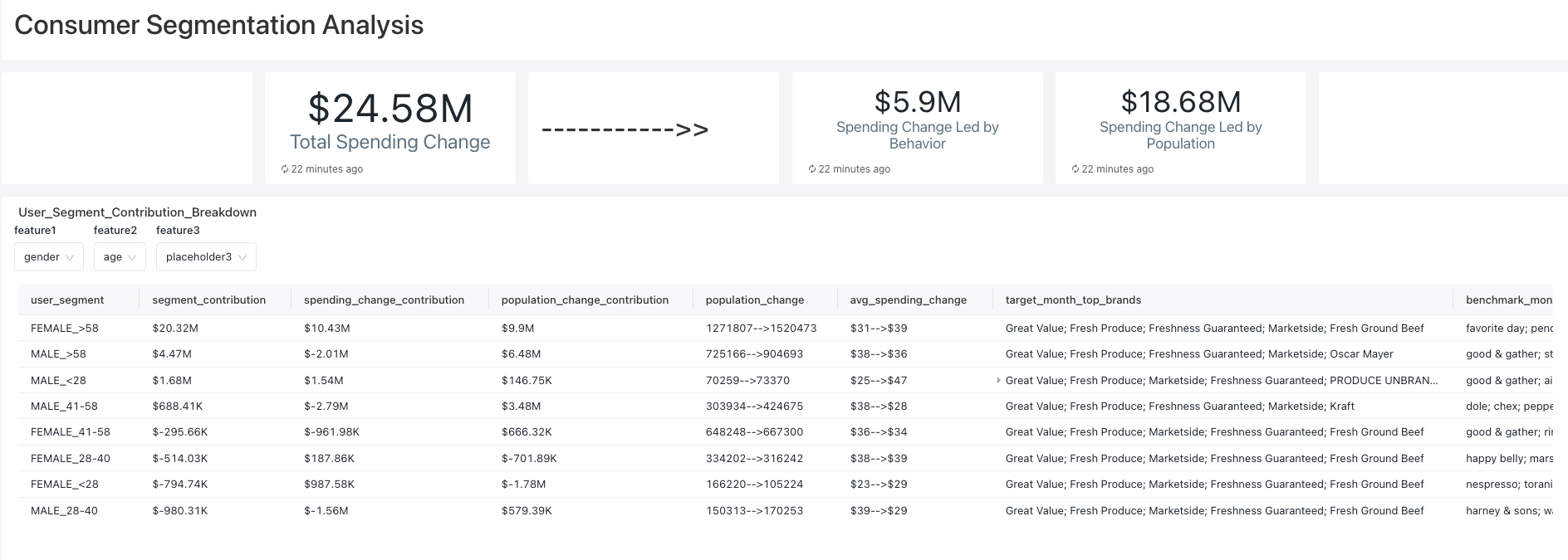 A pipeline tracking top sector movers based on metrics related to customer consumption to inform potential investment opportunities, identifying top demographic factors of customers correlated to the metric movement, and analyzing structural vs behavioral contribution of representative customer segments to the change.