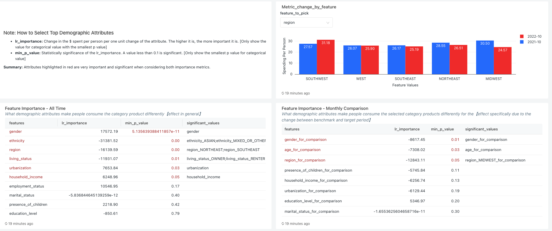 The panel has included selected metric of interest, sector/category selected, details of metric changes, ranked demographic factors and their values over periods.