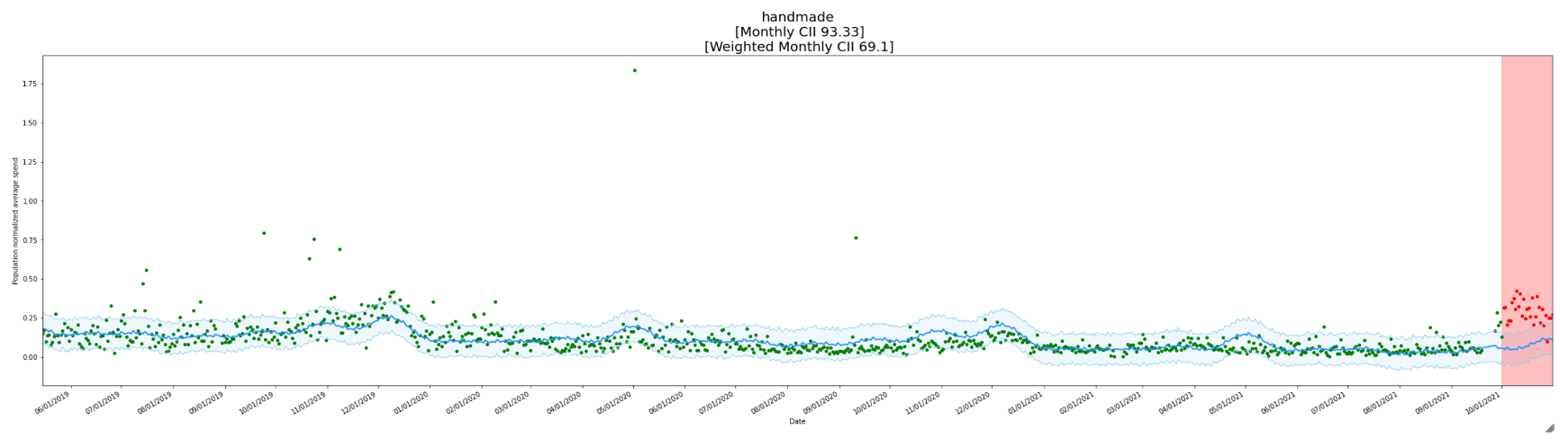 Each time series model is built on each metric under individual product category. Fitting the historical data, the model will output a projection for specified time window e.g one month. Based on the actual values for the metric and the projection, we design an indicator (consumer impact index or CII) that measures the degree of deviation of the actual values away from the projection such that the higher the indicator score is, the more deviate those actual points are.